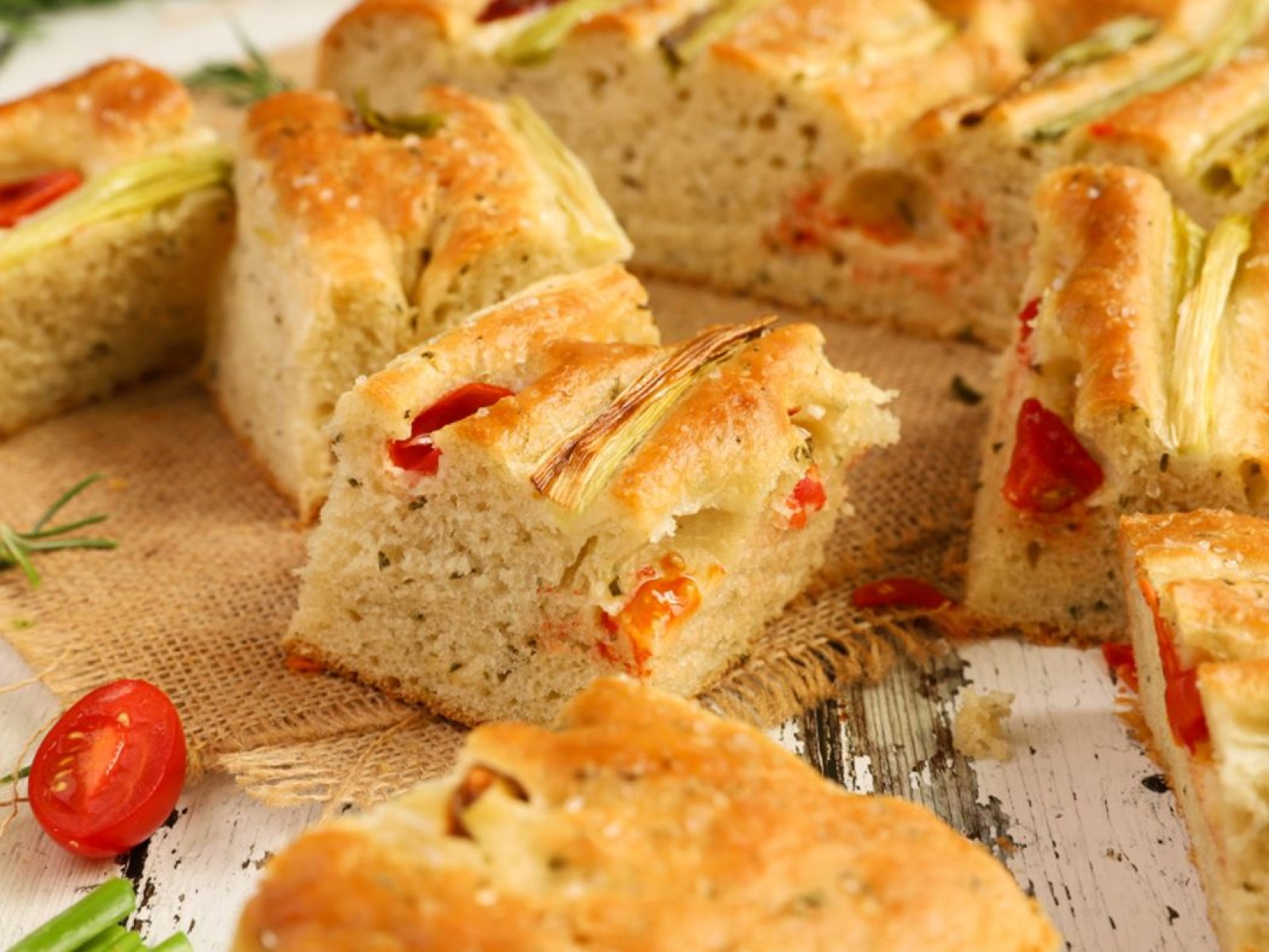 Φοκάτσια με φρέσκα κρεμμυδάκια και ντοματίνια (Focaccia)