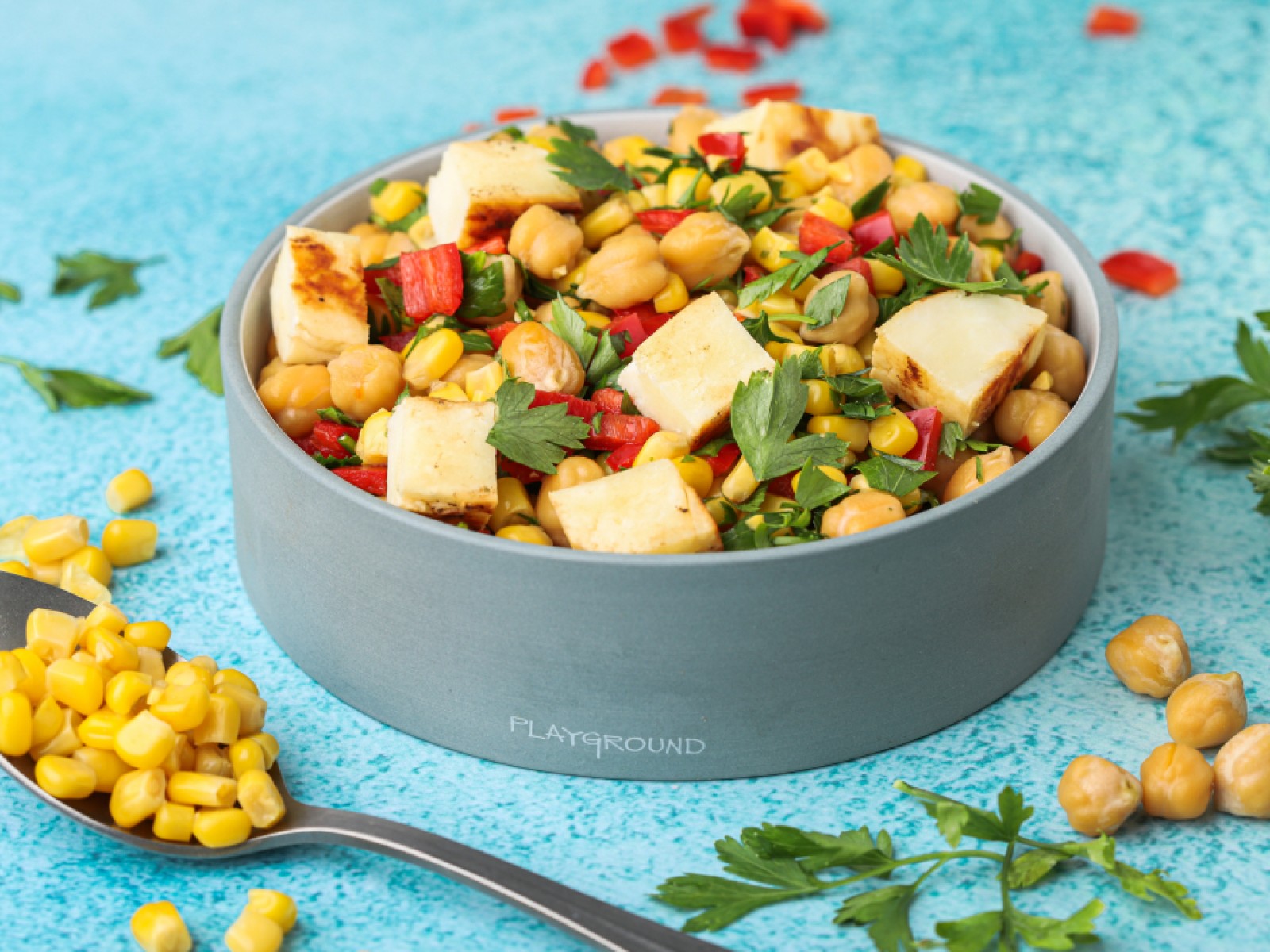 Ο Σεφ Γιώργος Τσούλης αποκαλύπτει μια άκρως γευστική, πανεύκολη και γρήγορη συνταγή για vegetarian σαλάτα. Σαλάτα με ρεβίθια και ψητό χαλούμι, χωρίς γλουτένη. Ελαφριά και πεντανόστιμη με το τυρί που αγαπάμε.